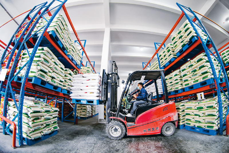 图为2020年4月3日,重庆市江津区储备粮有限公司的成品大米仓库内,工作人员正在装卸袋装大米。新华社记者 刘潺/摄