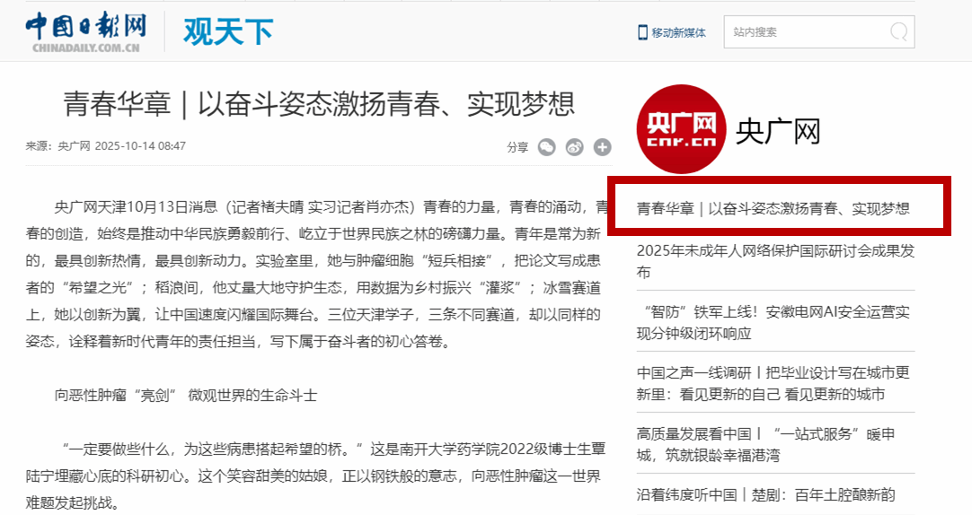 近日,央广网以“青春华章︱以奋斗姿态激扬青春、实现梦想”为题报道了南开大学、天津体育学院和我校园艺园林学院农艺与种业专业研究生卫佳晨等三位学子,在三条不同赛道以同样姿态诠释新时代青年责任担当,写下属于奋斗者初心答卷的故事。