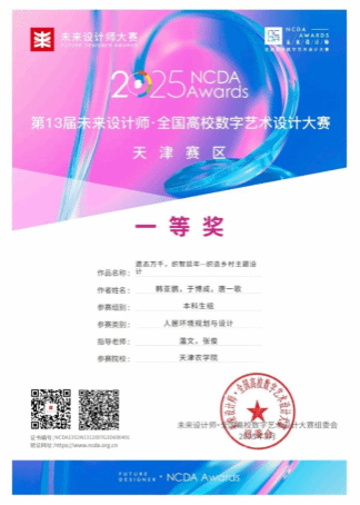 近日,第13届未来设计师·全国高校数字艺术设计大赛(NCDA)天津赛区评选结果揭晓。我校园艺园林学院再传捷报,环境设计专业2023级学生韩亚鹏、于博成、唐一歌,在温文、张俊老师的悉心指导下凭借作品《遗态万千,织智延年——织造乡村主题设计》,斩获天津赛区一等奖。