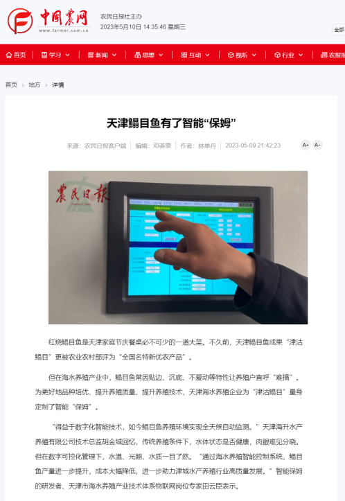 2023年5月9日,中国农网报道国家海水鱼产业技术体系智能化养殖岗位科学家、天津市海水养殖产业技术体系物联网岗位专家,我校计算机与信息工程学院教授田云臣及其团队共同研发的海水养殖智能控制系统。通过该系统,鳎目鱼产量进一步提升,成本大幅降低,进一步助力津城水产养殖行业高质量发展。