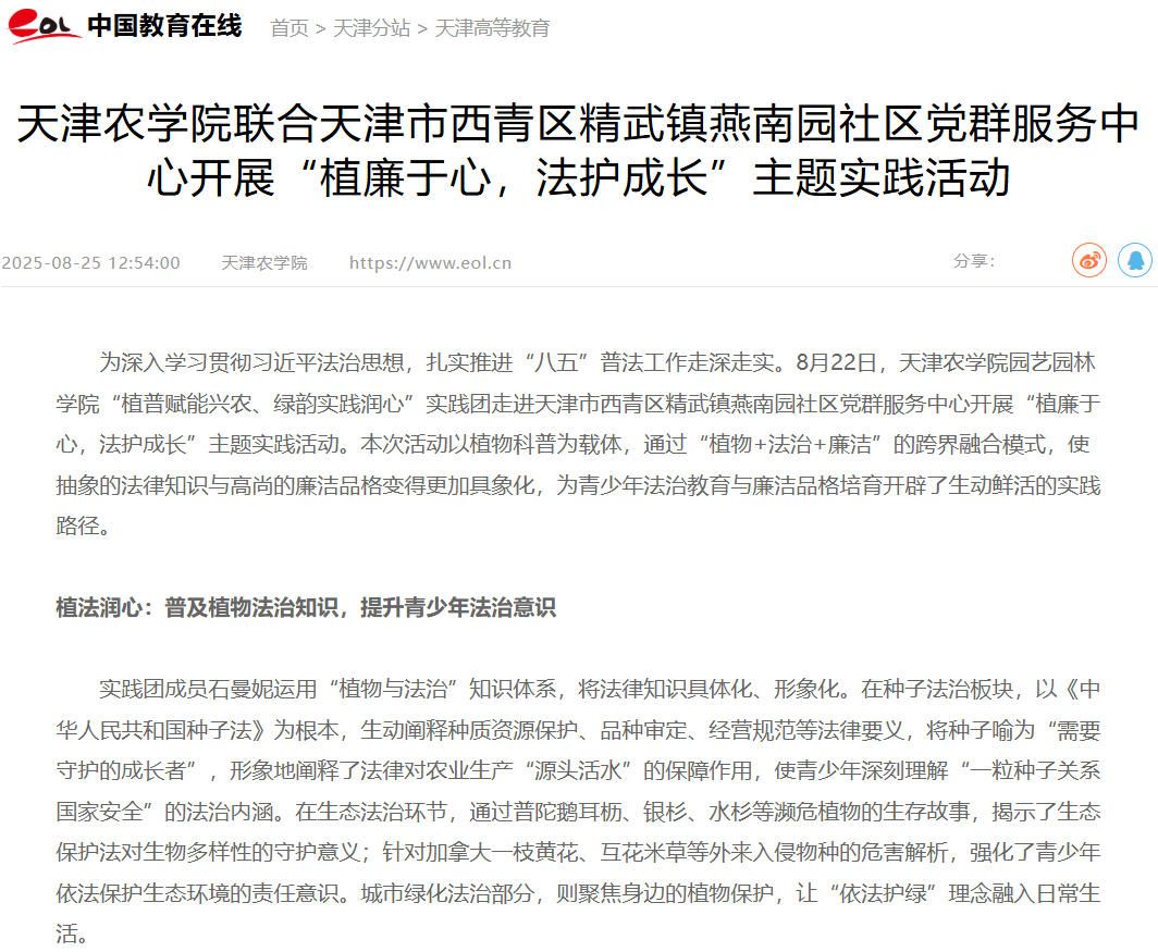 2025年8月25日,中国教育在线网报道,我校园艺园林学院“植普赋能兴农、绿韵实践润心”实践团走进天津市西青区精武镇燕南园社区党群服务中心开展“植廉于心,法护成长”主题实践活动。
