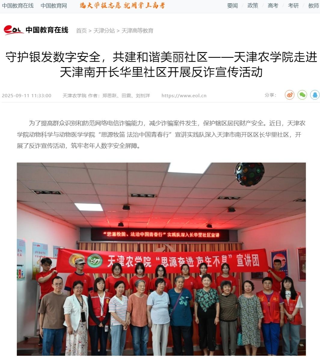 2025年9月12日,中国教育在线网报道,我校动物科学与动物医学学院“思源牧笛 法治中国青春行”宣讲实践队深入天津市南开区长华里社区,开展了反诈宣传活动,筑牢老年人数字安全屏障。