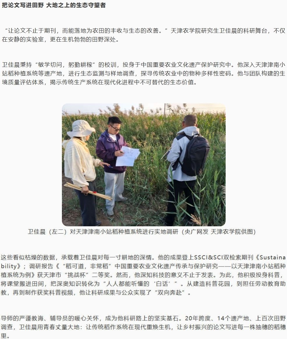 2025年10月13日,央广网客户端以《青春华章|以奋斗姿态激扬青春、实现梦想》为题,报道我校研究生卫佳晨秉持“敏学切问,躬勤耕稼”的校训,投身于中国重要农业文化遗产保护研究中。他深入天津津南小站稻种植系统等遗产地,进行生态监测与样地调查,探寻传统农业中的物种多样性密码。他与团队构建的生境质量评估体系,揭示传统生产系统在现代化进程中不可替代的生态价值。