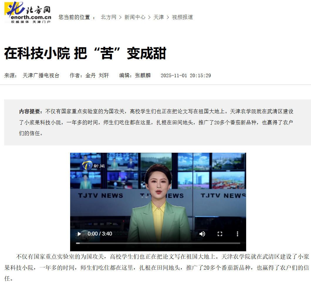 2025年11月1日,天津广播电视台报道我校小浆果科技小院的师生扎根在田间地头,推广了20多个番茄新品种,也赢得了农户们的信任。