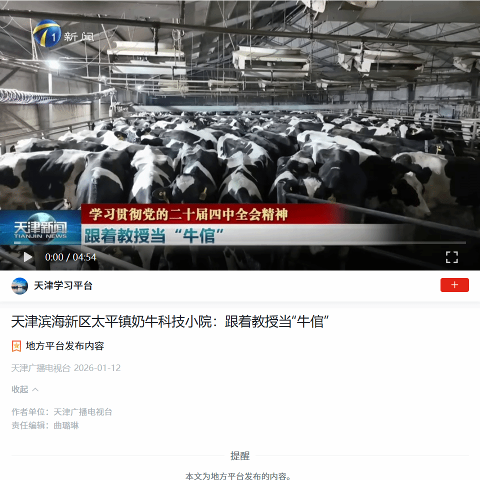 2026年1月12日,学习强国平台-天津广播电视台报道,我校滨海奶牛科技小院师生的工作事迹。