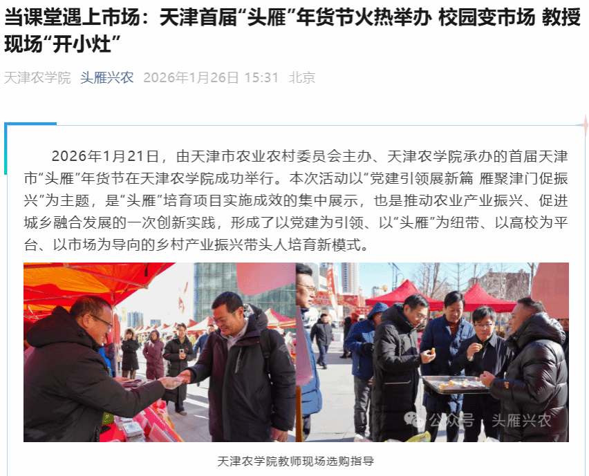 2026年1月26日,头雁兴农公众号报道,由天津市农业农村委员会主办、天津农学院承办的首届天津市“头雁”年货节在我校举行。