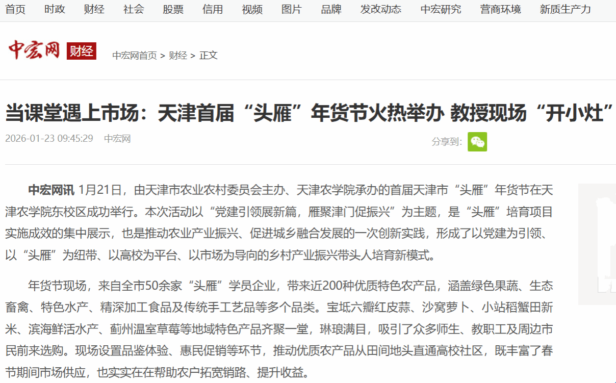 2026年1月23日,中宏网报道,由天津市农业农村委员会主办、天津农学院承办的首届天津市“头雁”年货节在我校举行。