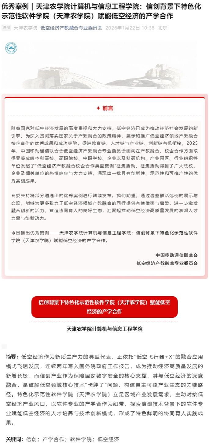 2026年1月30日,低空经济产教融合专业委员会公众号报道,在2025年“低空经济产教融合校企合作典型案例”征集活动中,我校计算机与信息工程学院案例获得优秀案例并进行展示。