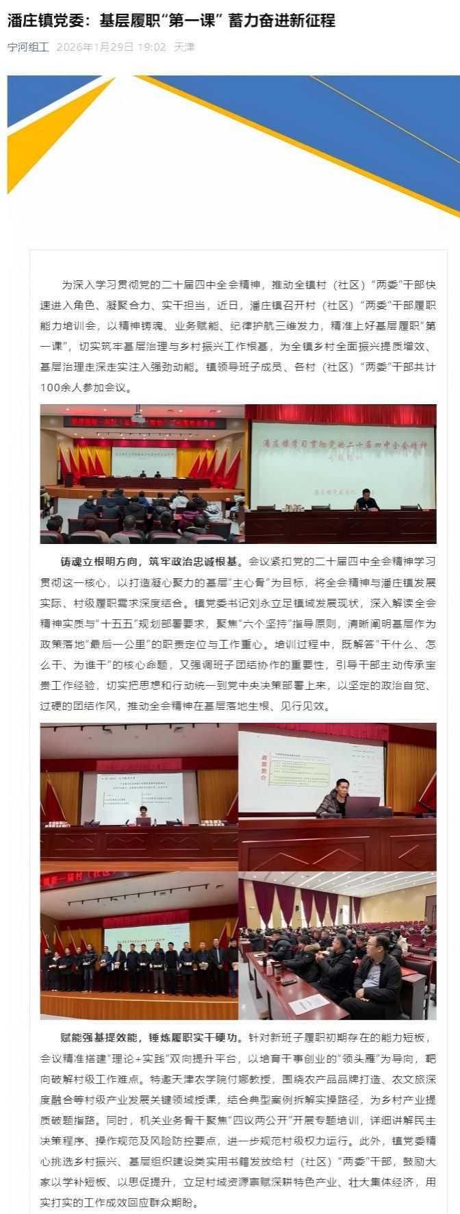 2026年1月29日,宁河组工公众号报道,我校人文学院付娜教授应邀赴潘庄镇围绕农产品品牌打造、农文旅深度融合等村级产业发展关键领域授课。
