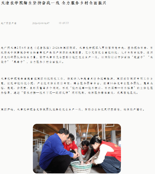 2026年2月8日,央广网报道,我校充分发挥农业高校科技、人才与教育优势,组织多支科研团队和师生力量,坚守我市及全国部分地区农业生产一线,以实际行动守护百姓“菜篮子”“米袋子”“果盘子”,全力服务乡村全面振兴。