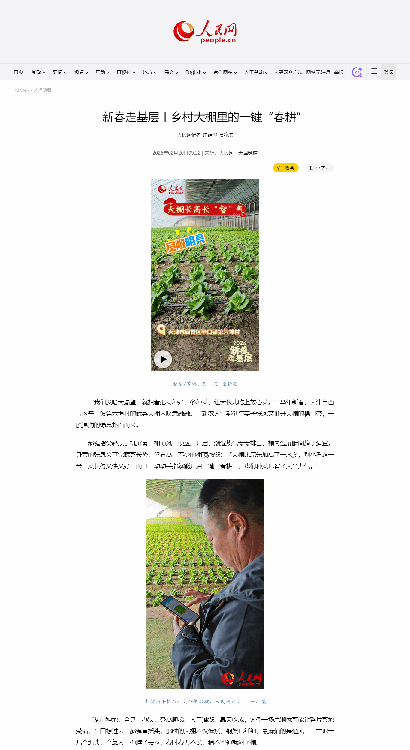 2026年2月20日,人民网报道,我校刘同海教授带领团队在第六埠村的精品蔬菜园通过AI精准调控水肥,让种植变得更加科学。