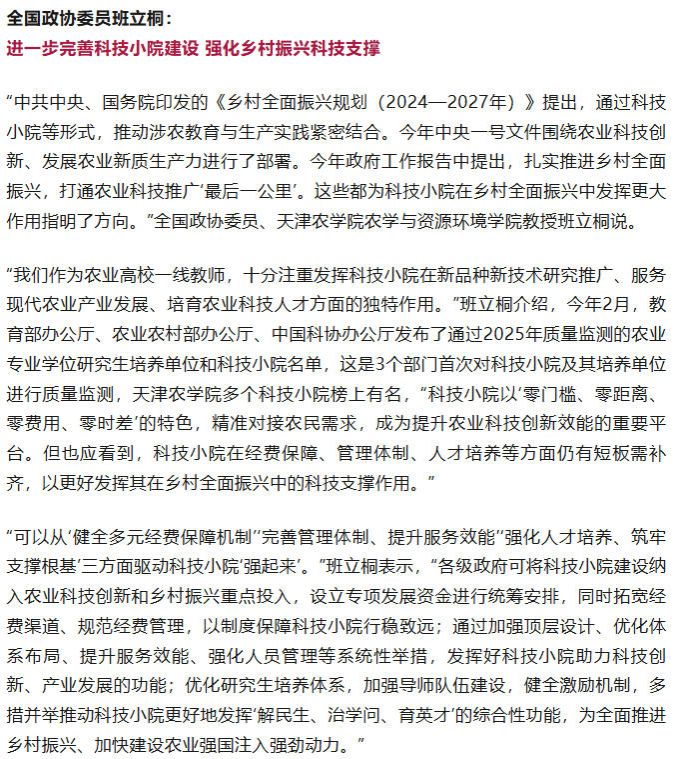 2026年3月12日,天津日报公众号报道,全国政协委员、我校班立桐教授围绕乡村全面振兴积极建言献策。