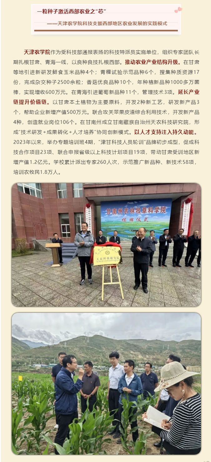 2026年3月13日,津门教育公众号报道,教育部公布第八届省属高校精准帮扶典型项目推选结果,我校报送的项目《一粒种子激活西部农业之“芯”——天津农学院科技支援西部地区农业发展的实践模式》成功入选。