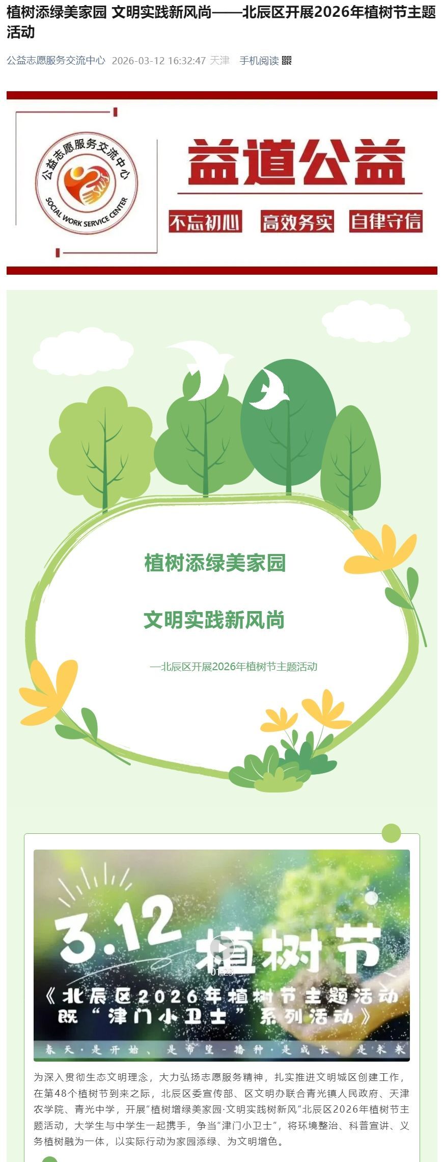 公益志愿服务交流中心公众号报道我校园艺园林学院师生参与北辰区2026年植树节主题活动