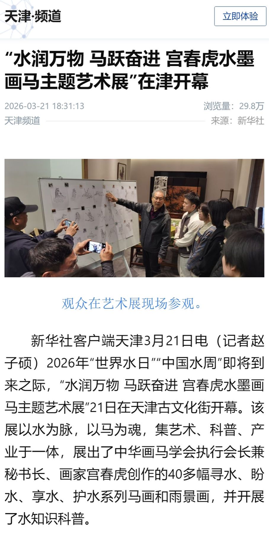 近日,“水润万物 马跃奋进——宫春虎水墨画马主题艺术展”在天津古文化街开幕,这是天津市首次在世界水日举办著名画家主题艺术展活动。我校水利工程学院为本次活动协办单位。水文教师党支部书记、张茜副教授获邀分享了关于天津海河水文化历史、资源分布以及用水格局等方面的科普知识。本次活动引发了强烈的社会反响,同时在中国新闻网、新华社天津频道、中国网、北方网等主流媒体亦得到广泛宣传。