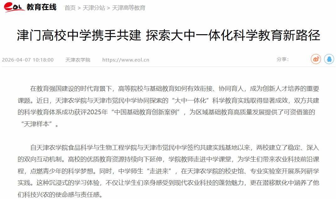2026年4月7日,中国教育在线网报道,我校与天津市觉民中学协同探索的“大中一体化”科学教育实践取得显著成效,双方共建的科学教育体系获评2025年“中国基础教育创新案例”。