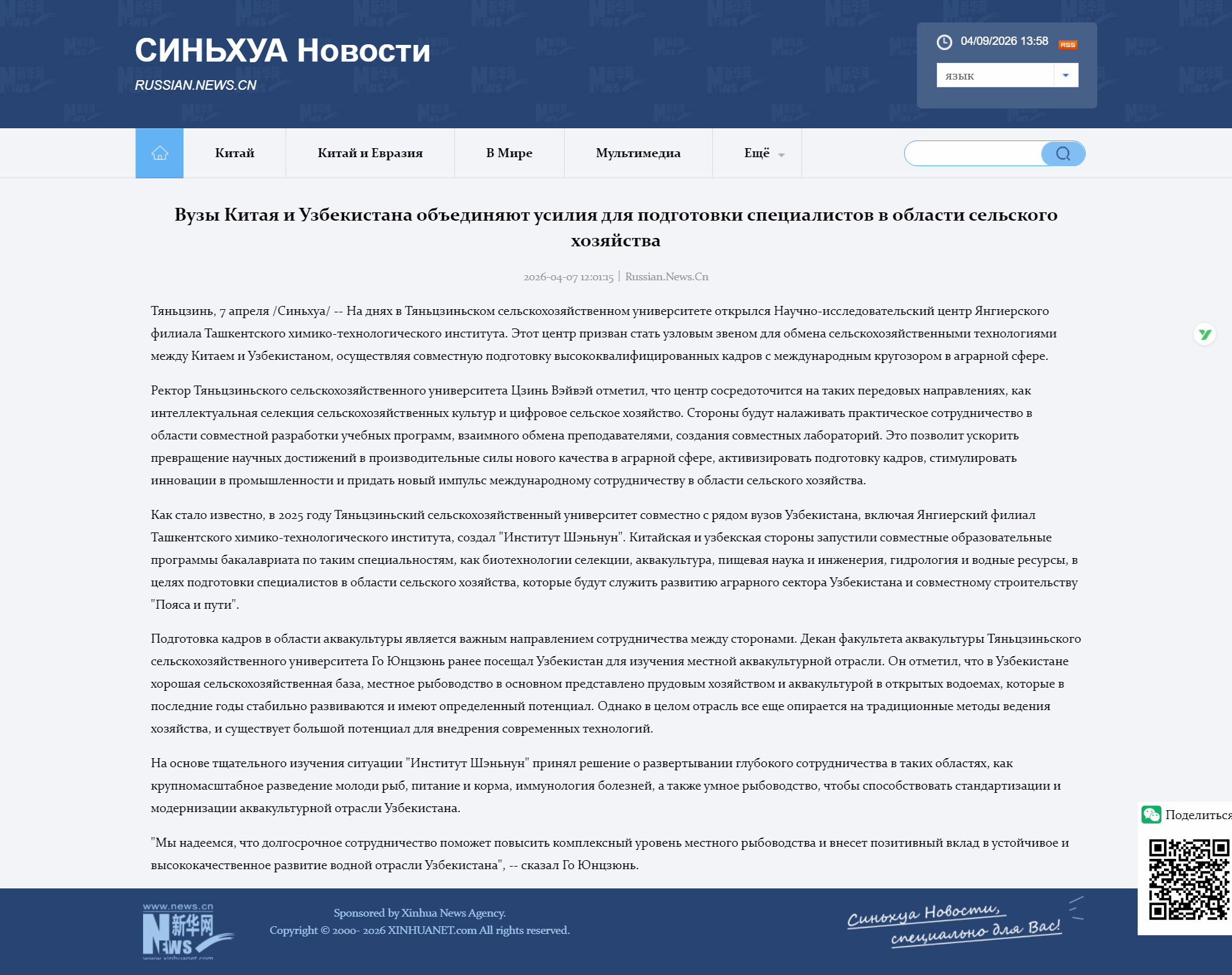 2026年4月8日,新华网海外版报道,塔什干化工大学杨吉尔分校研究中心在我校成立。该中心旨在成为中乌之间农业技术交流的枢纽,共同培养具有国际视野的农业领域高级人才。