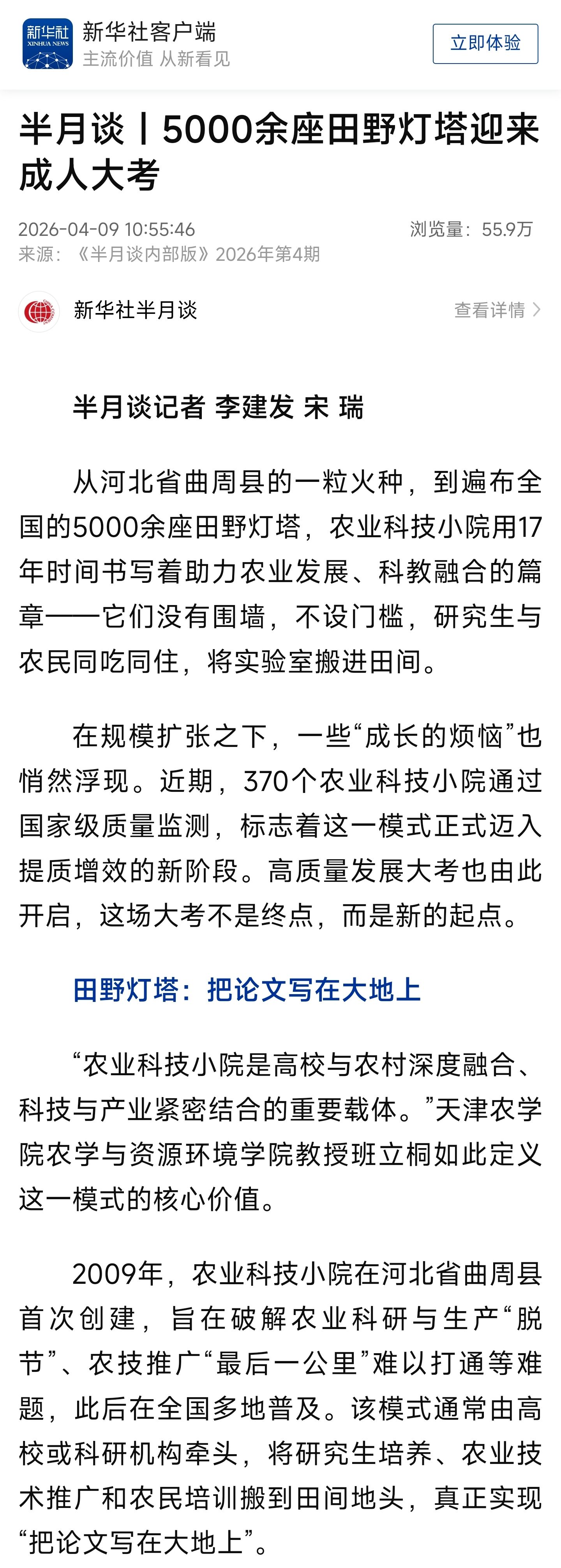 2026年4月9日,新华社客户端《半月谈》专栏报道我校班立桐教授扎根田间推动科技小院建设,推广食用菌技术,助力农民增收,并为该模式发展建言献策。