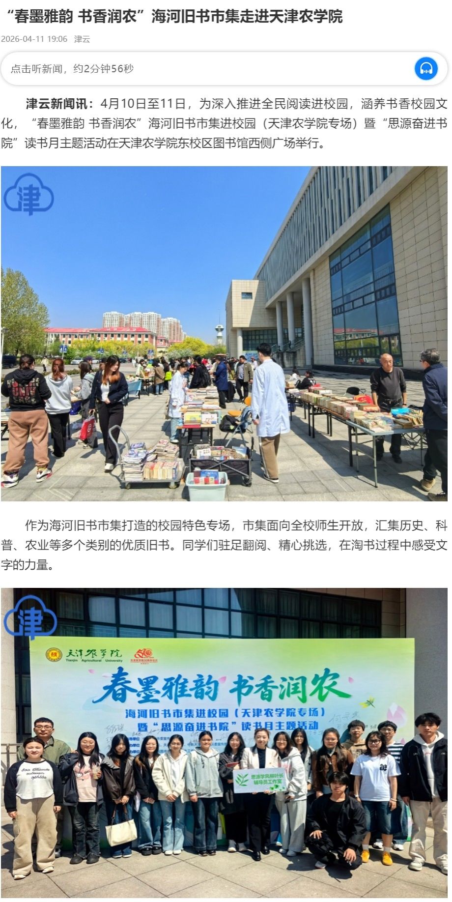 2026年4月11日,津云报道,“春墨雅韵 书香润农”海河旧书市集进校园(天津农学院专场)暨“思源奋进书院”读书月主题活动在我校东校区图书馆西侧广场举办。