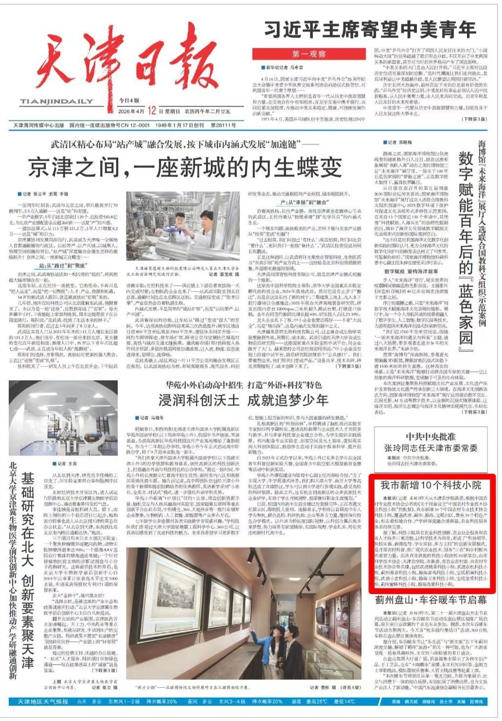 2026年4月11日,《天津日报》头版报道,我校新增10家中国农村专业技术协会科技小院,覆盖武清、蓟州、静海、宝坻四区,聚焦10个特色产业,标志着校地合作、产学研深度融合出新篇,农业科技服务体系持续完善。
