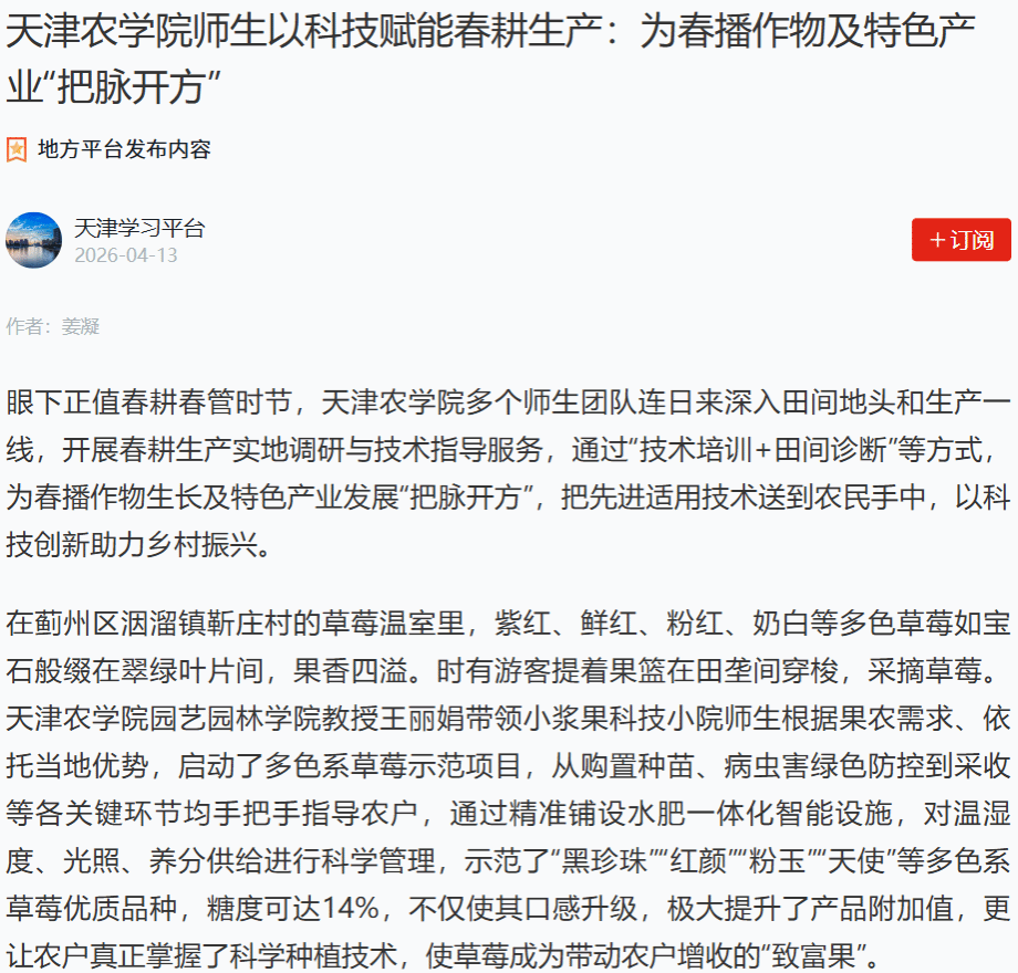 2026年4月13日,学习强国平台-天津学习平台报道,我校多个师生团队连日来深入田间地头和生产一线,开展春耕生产实地调研与技术指导服务,通过“技术培训+田间诊断”等方式,为春播作物生长及特色产业发展“把脉开方”,把先进适用技术送到农民手中,以科技创新助力乡村振兴。